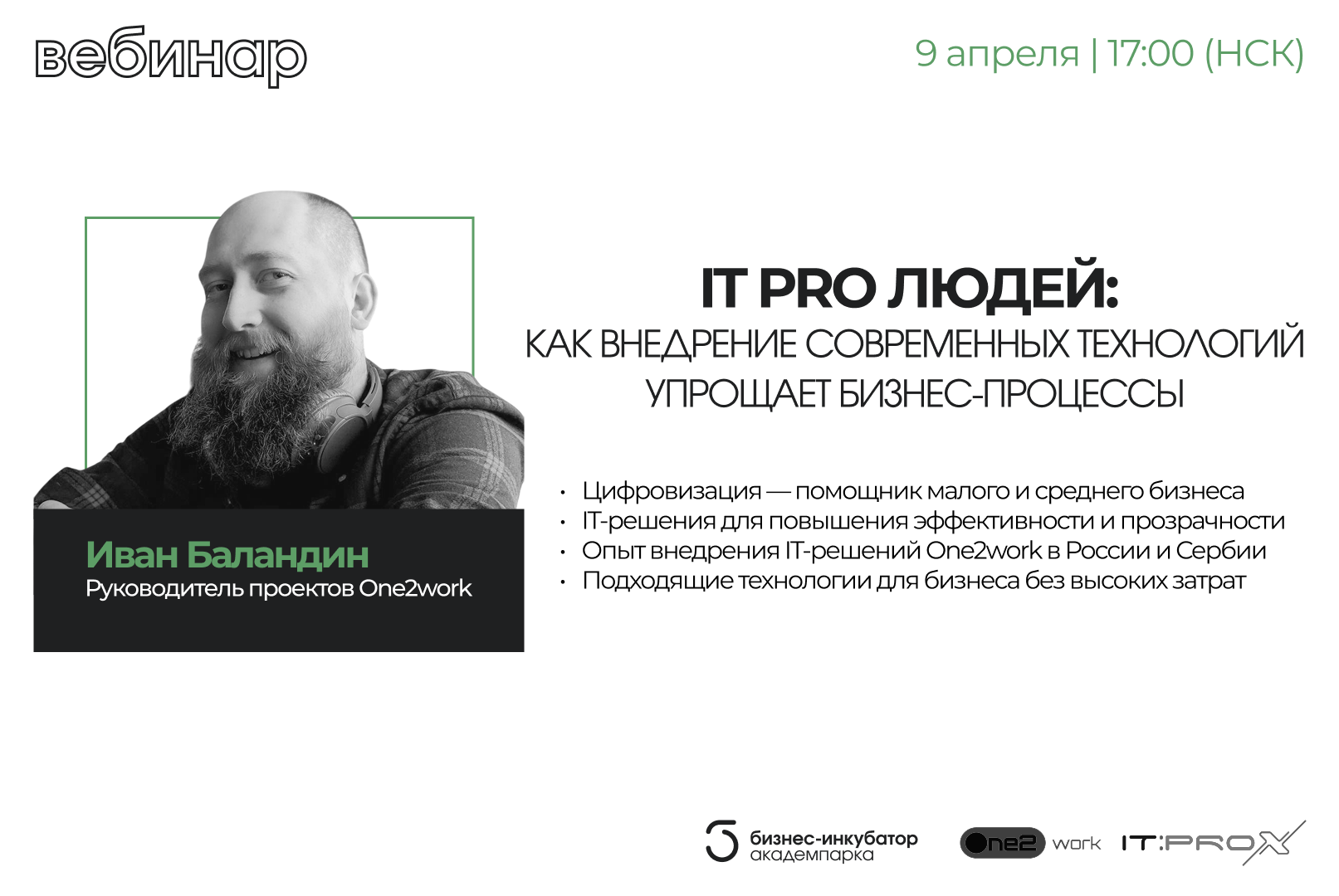 Малый и средний бизнес часто воспринимает цифровизацию как сложный и дорогой процесс. На нашем вебинаре мы развеем этот миф. Узнайте, как современные IT решения могут существенно упростить ваши бизнес-процессы, сократить расходы и повысить конкурентоспособность — независимо от размера компании. Иван Баландин, руководитель проектов One2work, поделится реальным опытом внедрения IT решений в России и Сербии и расскажет, как легко и эффективно интегрировать технологии для ускорения роста вашего бизнеса.